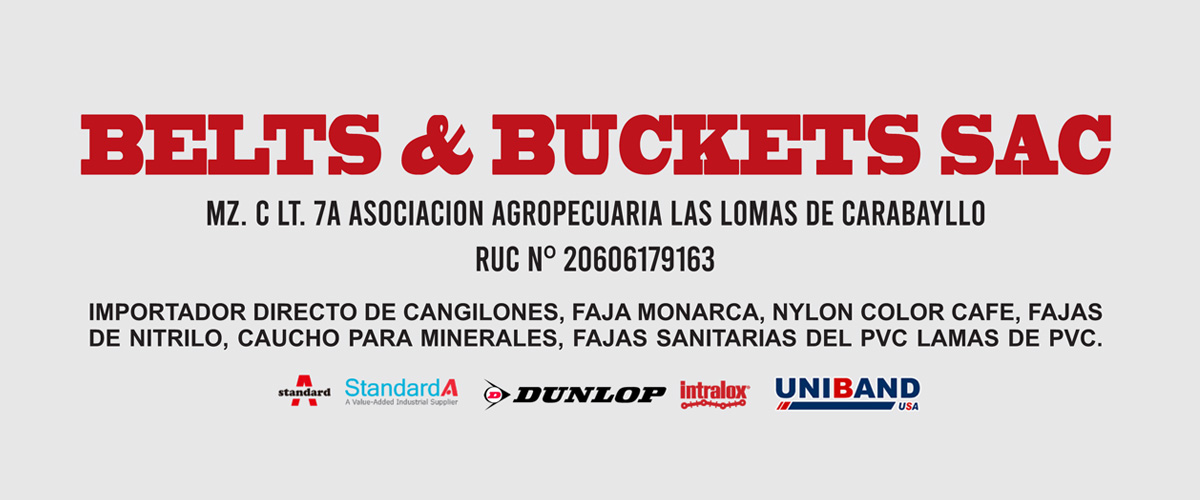 BELTS & BUCKETS S.A.C. tendrá como giro principal la importación directa y distribución de fajas transportadoras sanitarias, fajas transportadoras de pvc y de poliuretano, también se dedicará a la importación directa de Cangilones de Polietileno, Poliuretano, Nylon. Las empaquetaduras de teflón expandible 100% virgen Marca SEALON estilo 1106; asimismo como giro complementario tendrá la comercialización de las Grapas Marca Flexco (Procedente de EE.UU., líder mundial y en todo el Perú en dicho rubro) específicamente y fundamentalmente el Estilo ALLIGATOR para unir las fajas transportadoras de pvc y de poliuretano, y además para unir las fajas planas de distribución.